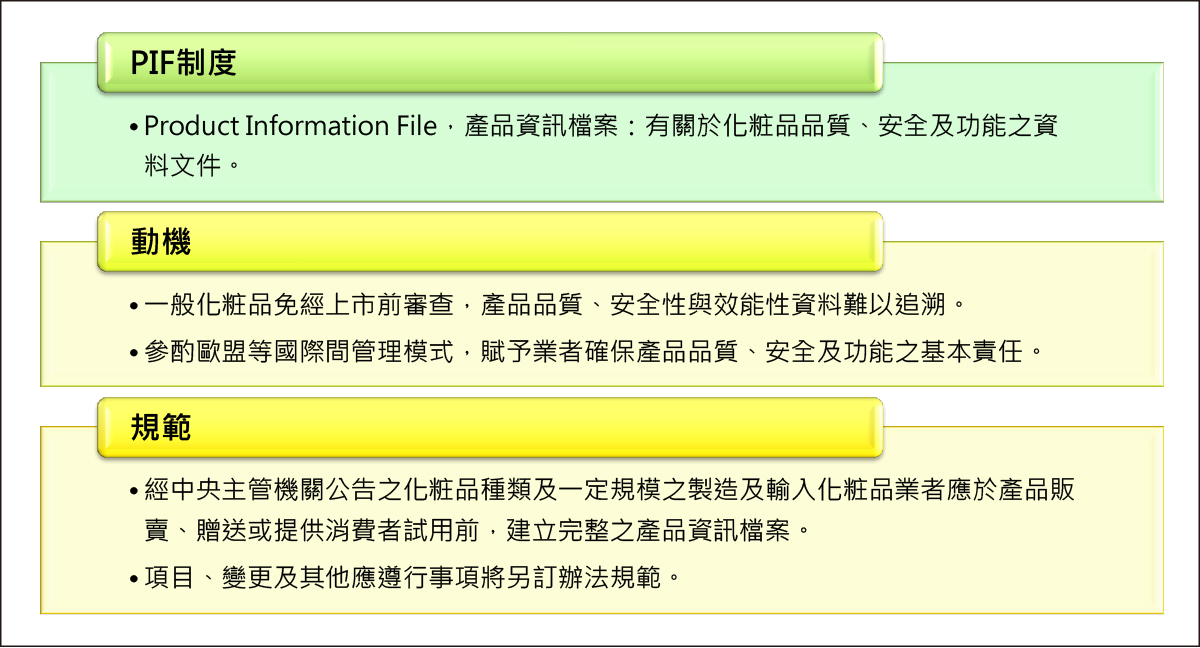 化粧品衛生、安全及品質要求,一直是各國衛生當局積極努力的目標,目前歐盟與東協均有法規或文令來明定業者於產品上市前,應建立產品資訊檔案(PIF;Product Information File),也就是化粧品的產品履歷,能從產品的原料、包材、品質、安全及功效相關文件整理後所呈現的履歷資料。而我國衛生福利部食品藥物管理署(以下簡稱TFDA)因應全球化市場發展及法規協和化趨勢,參酌國際規範推行「化粧品衛生安全管理法」修正案並經由 總統於2018年5月2日頒布施行後,我國化粧品管理制度可期望與國際接軌,降低化粧品產業面對國際市場之法規障礙,提升化粧品產業之國際競爭力。