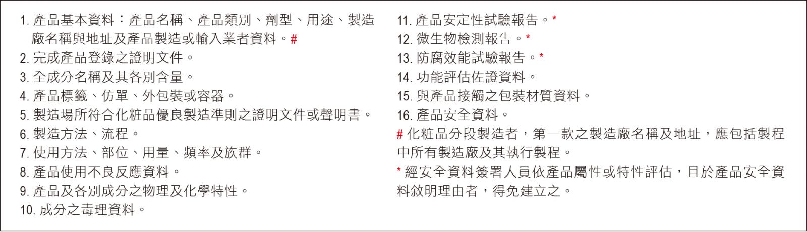 圖2:化粧品產品資訊檔案應有的項目及內容(https://www.fda.gov.tw/tc/includes/GetFile.ashx?id=f637026752332951272)