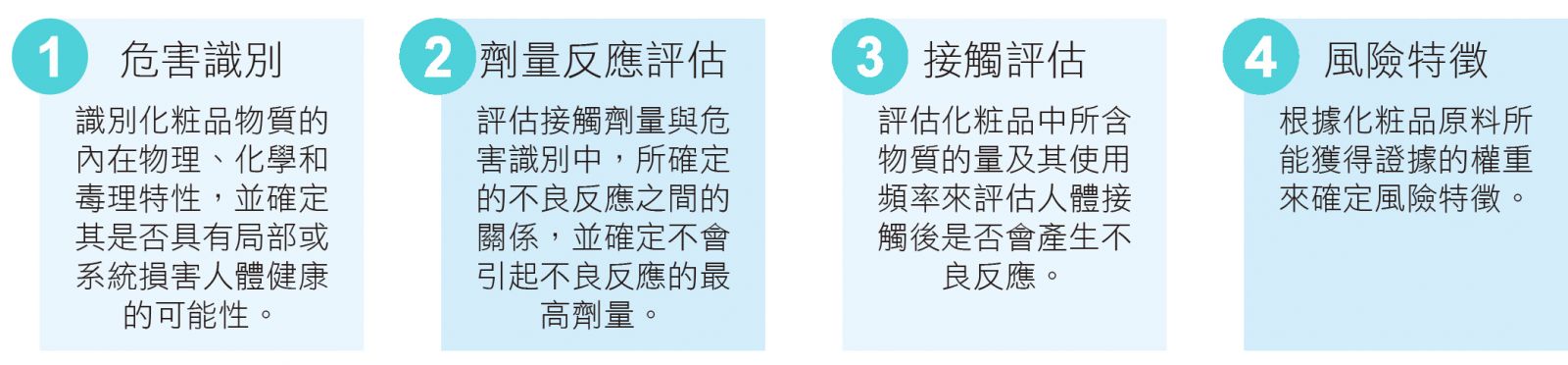 在歐洲化粧品,根據(EC)第1223/2009號法規的附件I,化粧品安全性評估報告 (CPSR)由兩部分組成;分別為「化粧品安全信息」及「化粧品安全評估」。而化粧品安全性評估採取的是一套基於風險而非基於危險的安全評估的方法,相關測試可概略區分化粧品安定性測試、化粧品安全性測試及皮膚過敏性等測試,一般來說可以細分為四個部份: