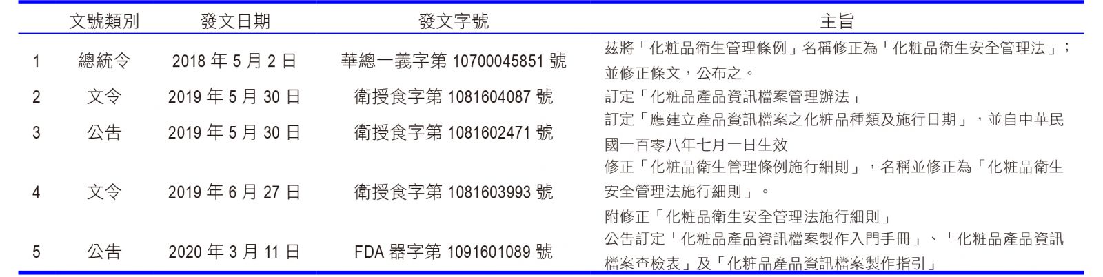 TFDA接續於2019年5月30日公告「化粧品產品資訊檔案管理辦法」及「應建立產品資訊檔案之化粧品種類及施行日期」兩項化粧品安全管理子法,並於今年7月1日起施行,此重大變革,在於督促化粧品製造或輸入業者,建立完整產品資訊檔案之項目、內容、變更、建立與保存方式,以及期限、地點、安全資料簽署人員資格及其他應遵行事項之辦法,並能落實做到保護消費者使用安全、也兼顧產業發展。